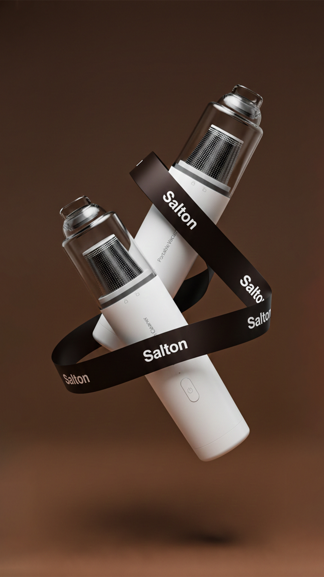 一张高端广告风格的产品照片。两款吸尘器在空中悬浮,构图动态且平衡。瓶子彼此成角度摆放,形成醒目的对角构图;一只稍靠前,另一只略后,营造深度与主次。两瓶身优雅缠绕一条宽黑棕缎带,缎带上均匀重复“Salton”品牌字样。字体工整、对比鲜明、清晰无变形,并沿缎带全长等距排布。缎带在瓶间顺滑延展,将二者联为整体,既未遮挡包装关键信息,也未与瓶身主品牌冲突。采用略低机位拍摄,瓶身微微倾斜,增强自信、力量与高端质感。背景为纯色摄影棚色调,深暖巧克力、黑焦糖或柔和赤陶色,干净极简,无任何分散注意力的细节。