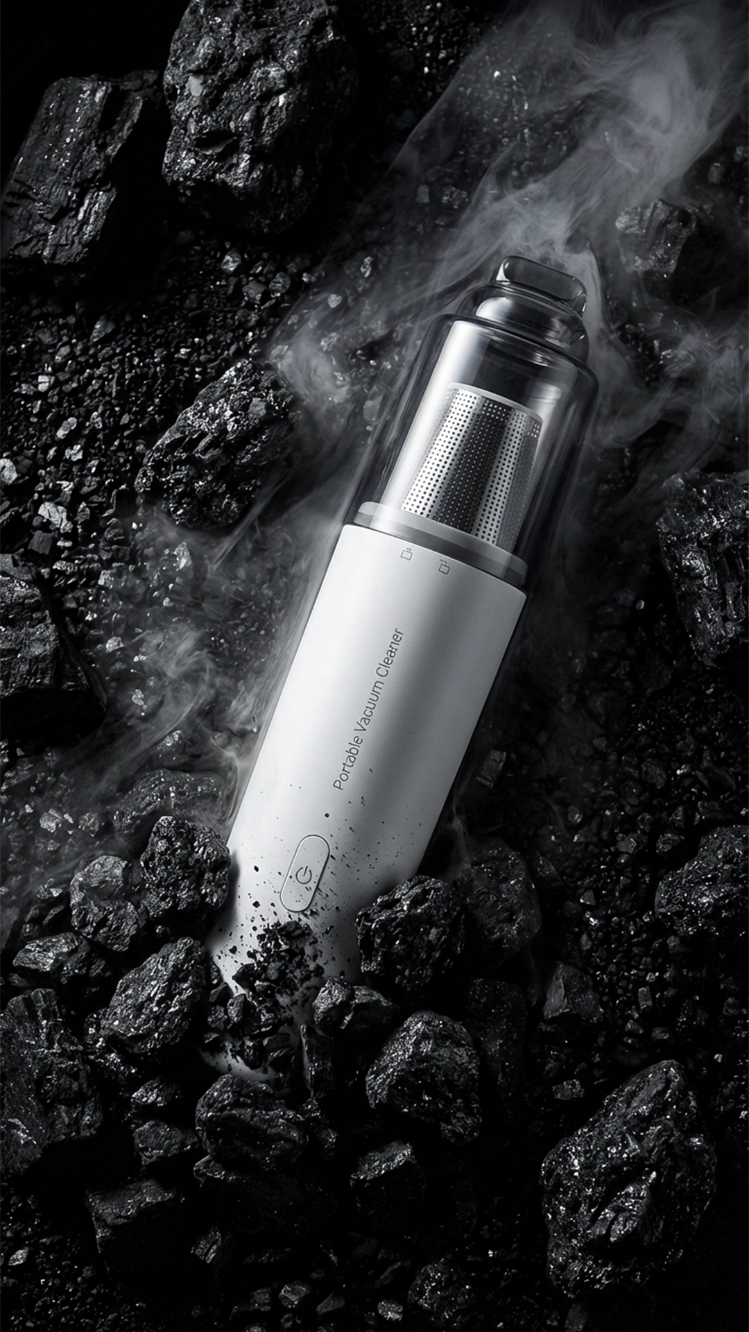 吸尘器半埋在细碎的黑色矿石和木炭颗粒中,表面凹凸不平,质感粗犷。空气中弥漫着流动的稀薄白色烟雾和薄雾,斜向穿过画面。