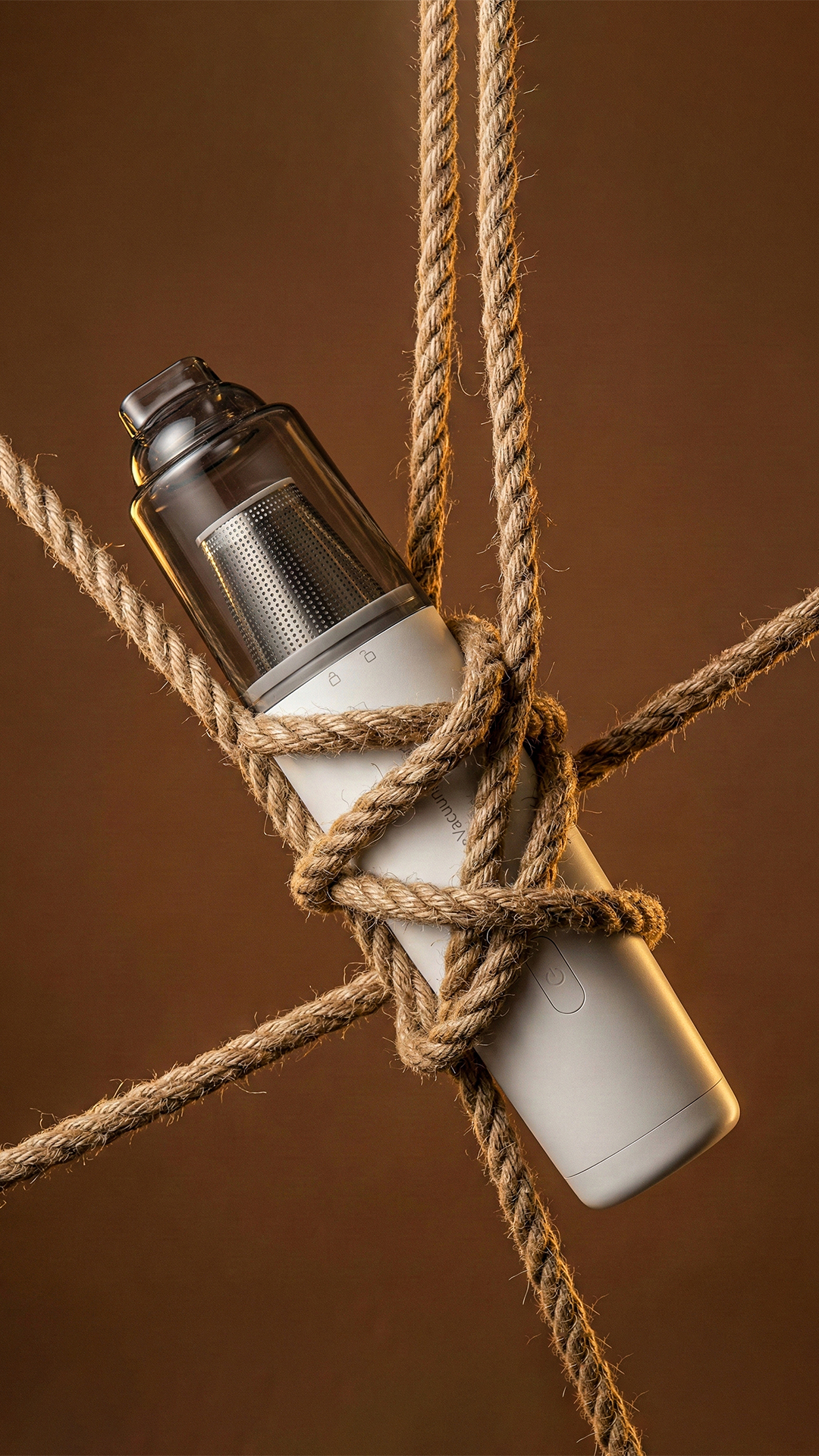 white vacuum cleaner, Elements: Thick rustic hemp ropes, intertwined, wrapped around the white vacuum cleaner, suspended in mid-air. Lighting: Moody studio lighting, soft rim light, cinematic shadows, warm golden tones. Background: Solid earthy brown background, minimalist, monochromatic palette. Style: High-end commercial product photography, 8k resolution, macro detail, sharp focus, hyper-realistic.