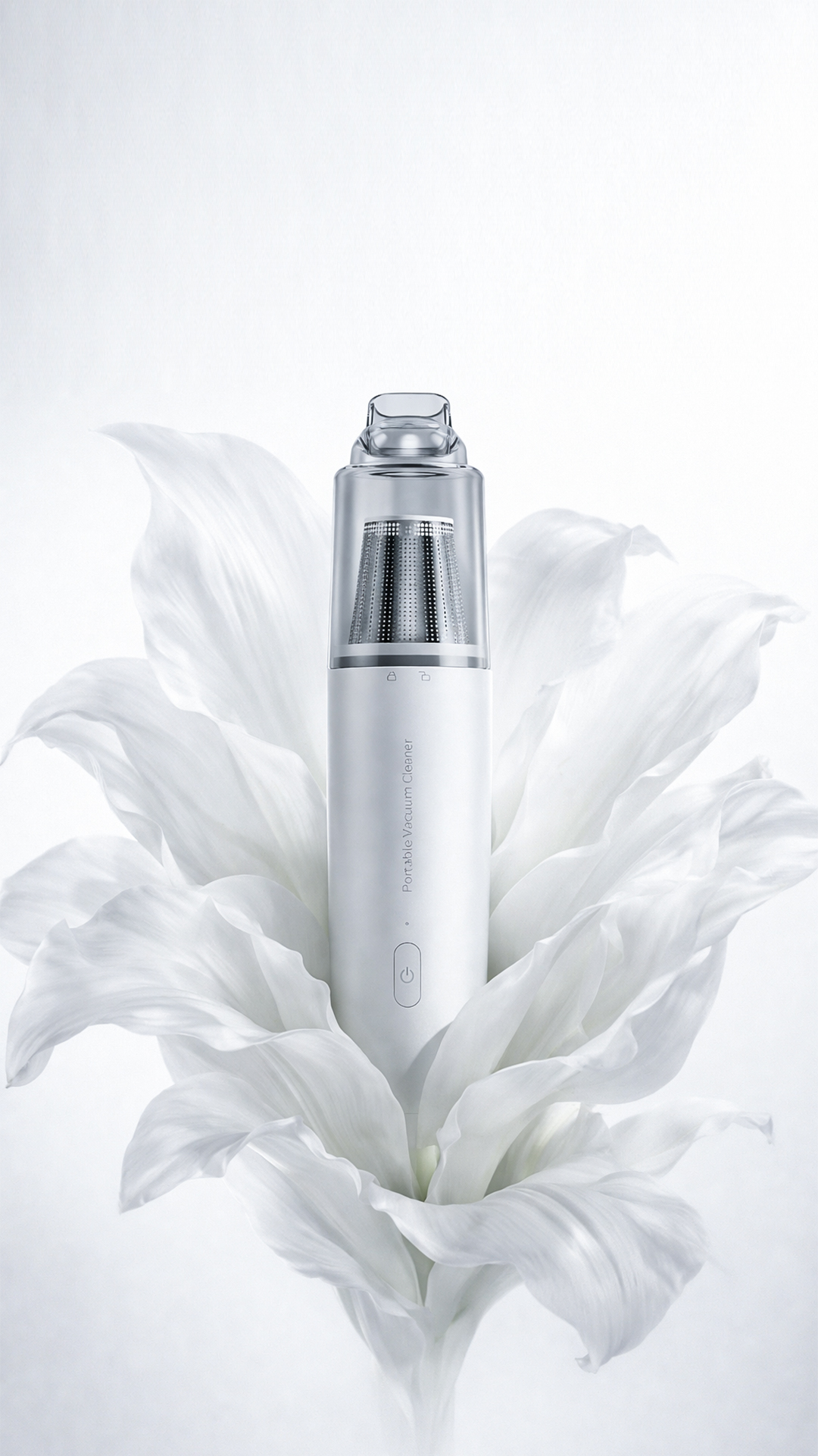 硬与软: 吸尘器是喷砂铝合金材质,具有冷冽、坚固的工业质感;花瓣则是半透明的有机组织,轻盈且娇嫩。