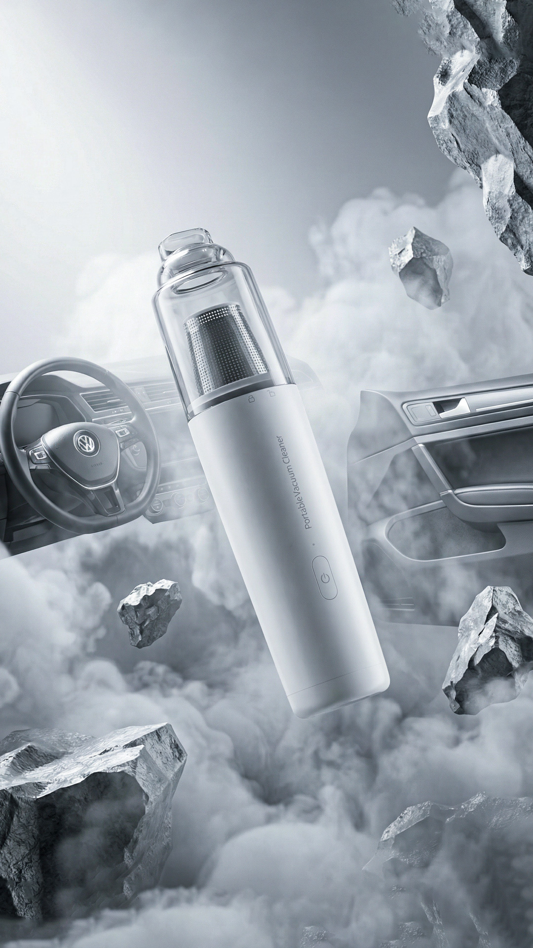 Commercial product photography of a sleek white handheld car vacuum cleaner, internal filter visible through a transparent canister, floating in mid-air. Surrounded by stylized grey rocks, floating car interior components (steering wheel with Volkswagen logo, car door panel), and realistic white smoke/mist. High-tech futuristic atmosphere, soft studio lighting, metallic texture, 8k resolution, cinematic composition, Unreal Engine 5 render style, minimalist aesthetic.